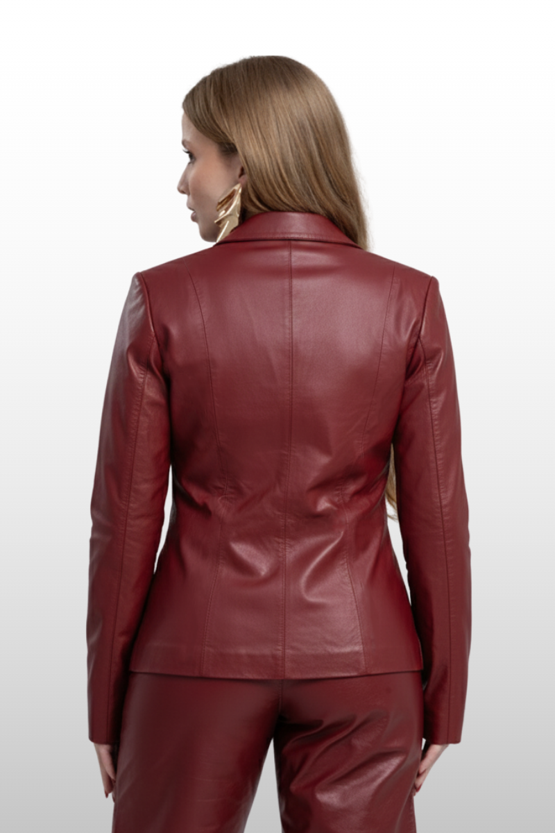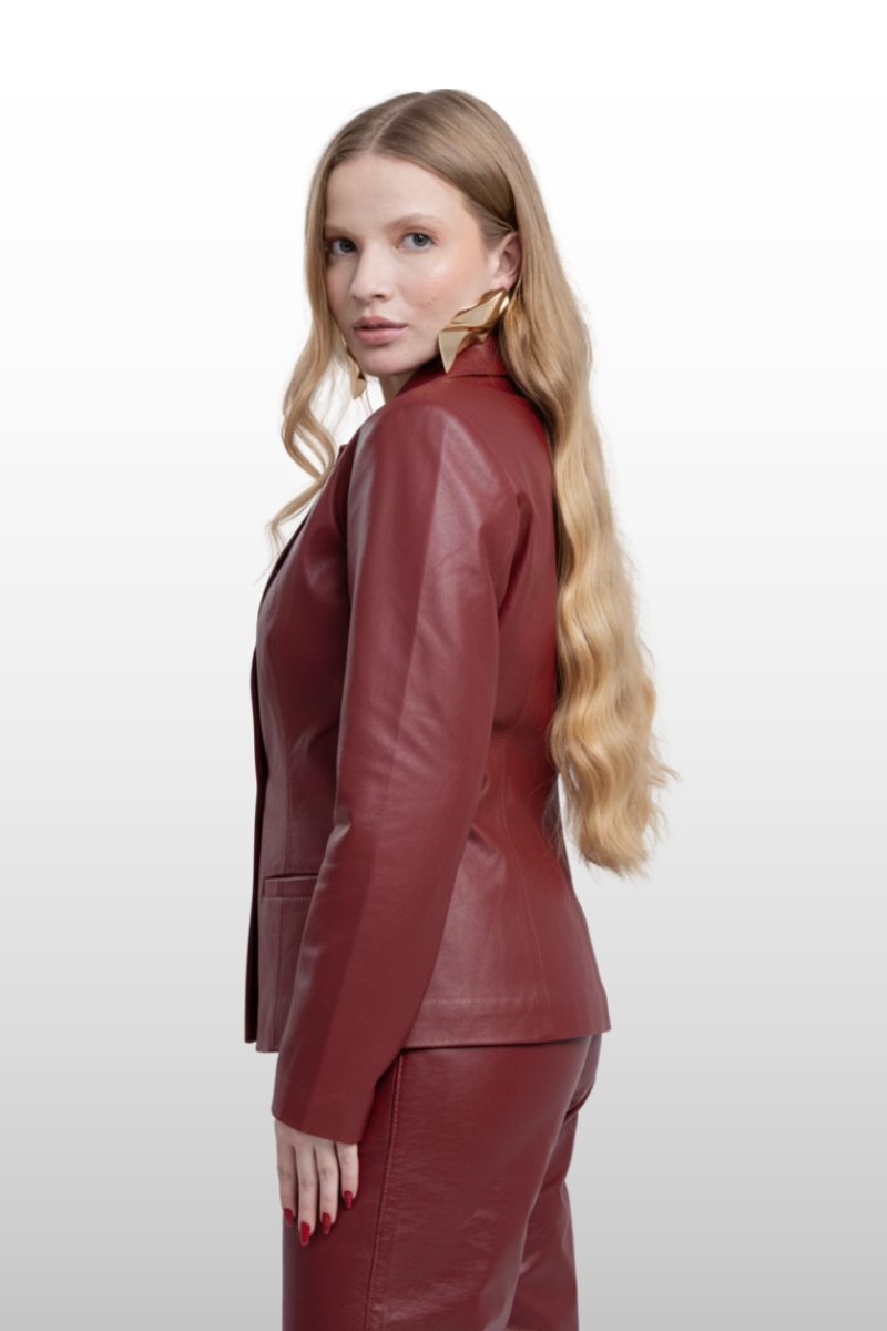 Blazer Marina em couro legítimo, com modelagem de cintura marcada. Possui fechamento frontal com botões encapados. Forro 100% poliéster.