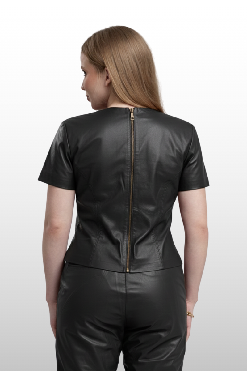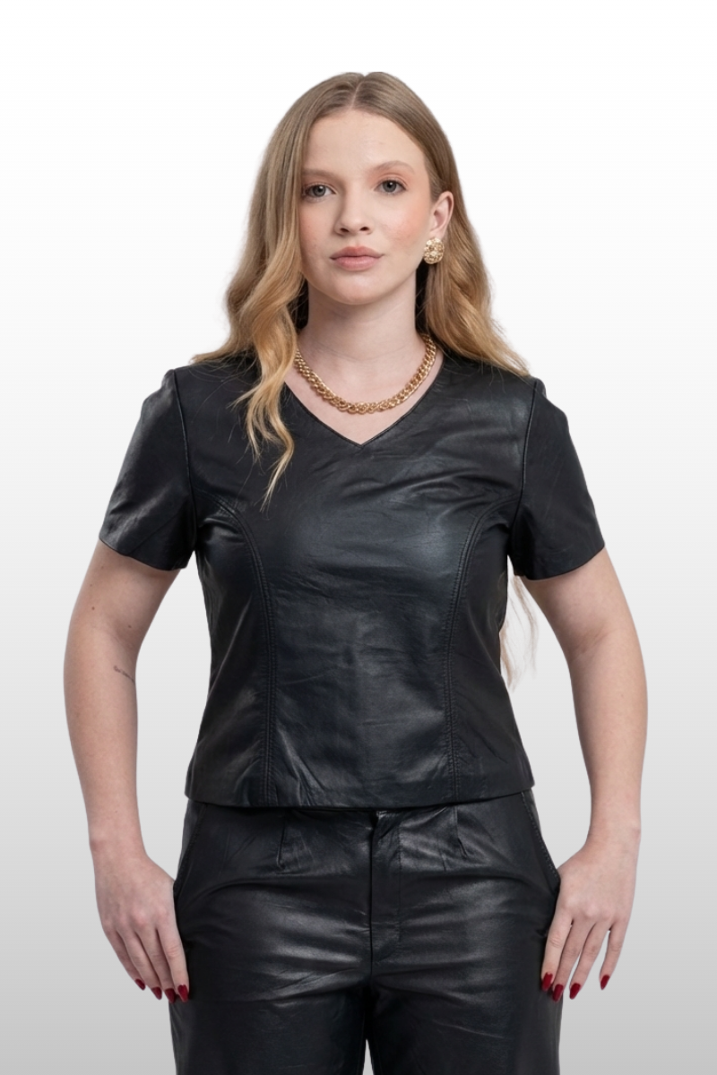 Camiseta Vania em couro legítimo, com modelagem de cintura marcada e decote V. Possui fechamento traseiro em zíper de metal. Forro 100% poliéster.