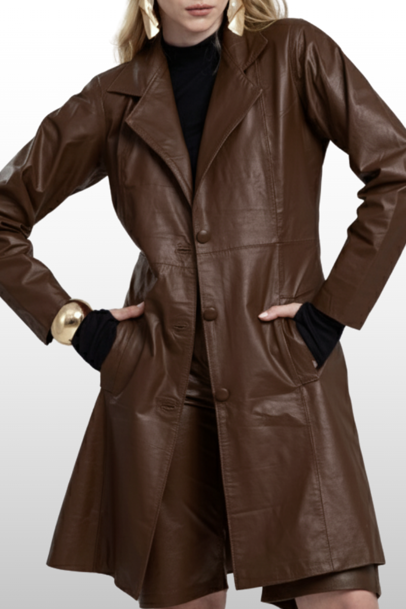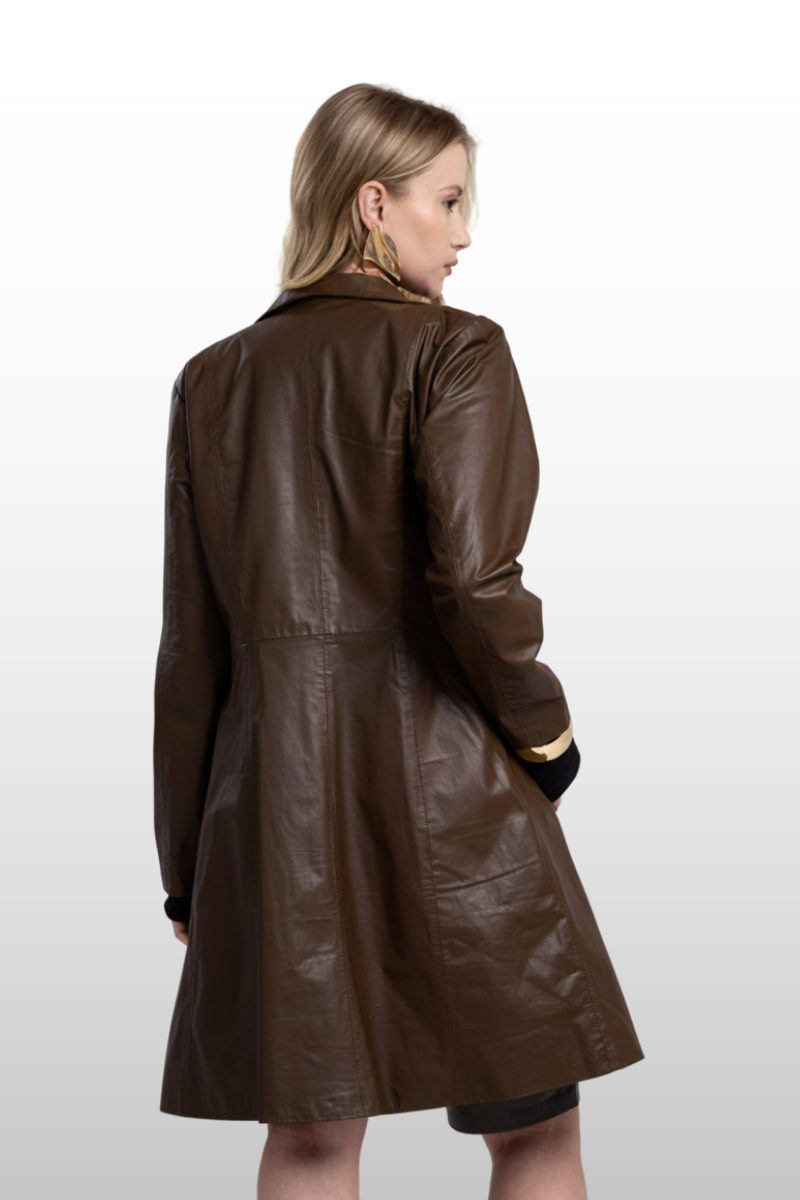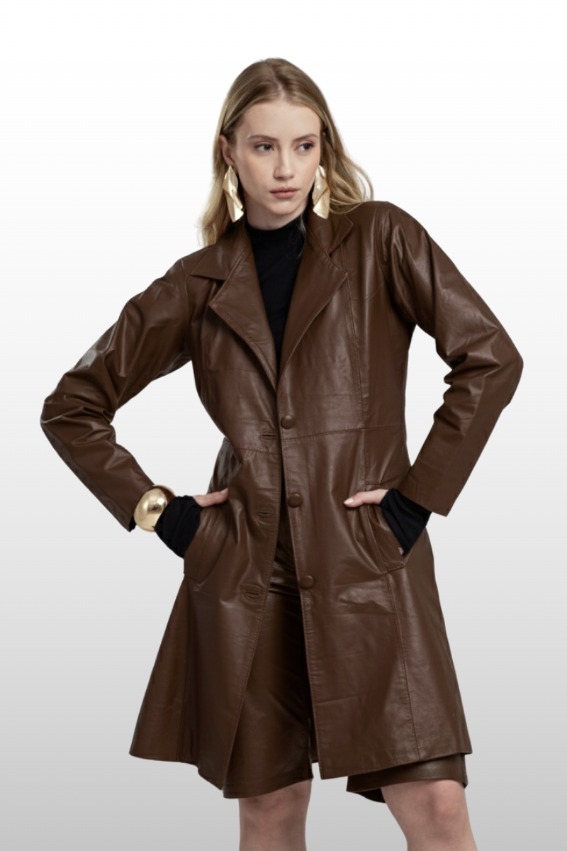 Casaco Bela em couro legítimo, com modelagem de cintura marcada. Possui dois bolsos laterais e fechamento frontal com botões encapados. Forro 100% poliéster.