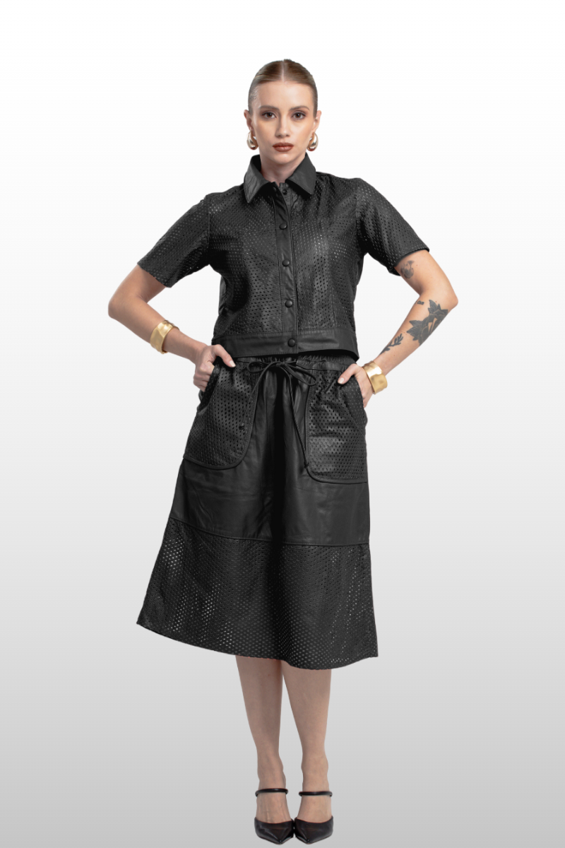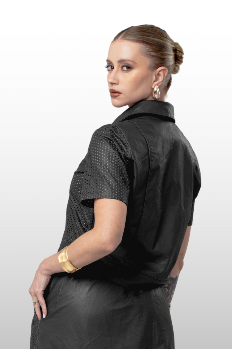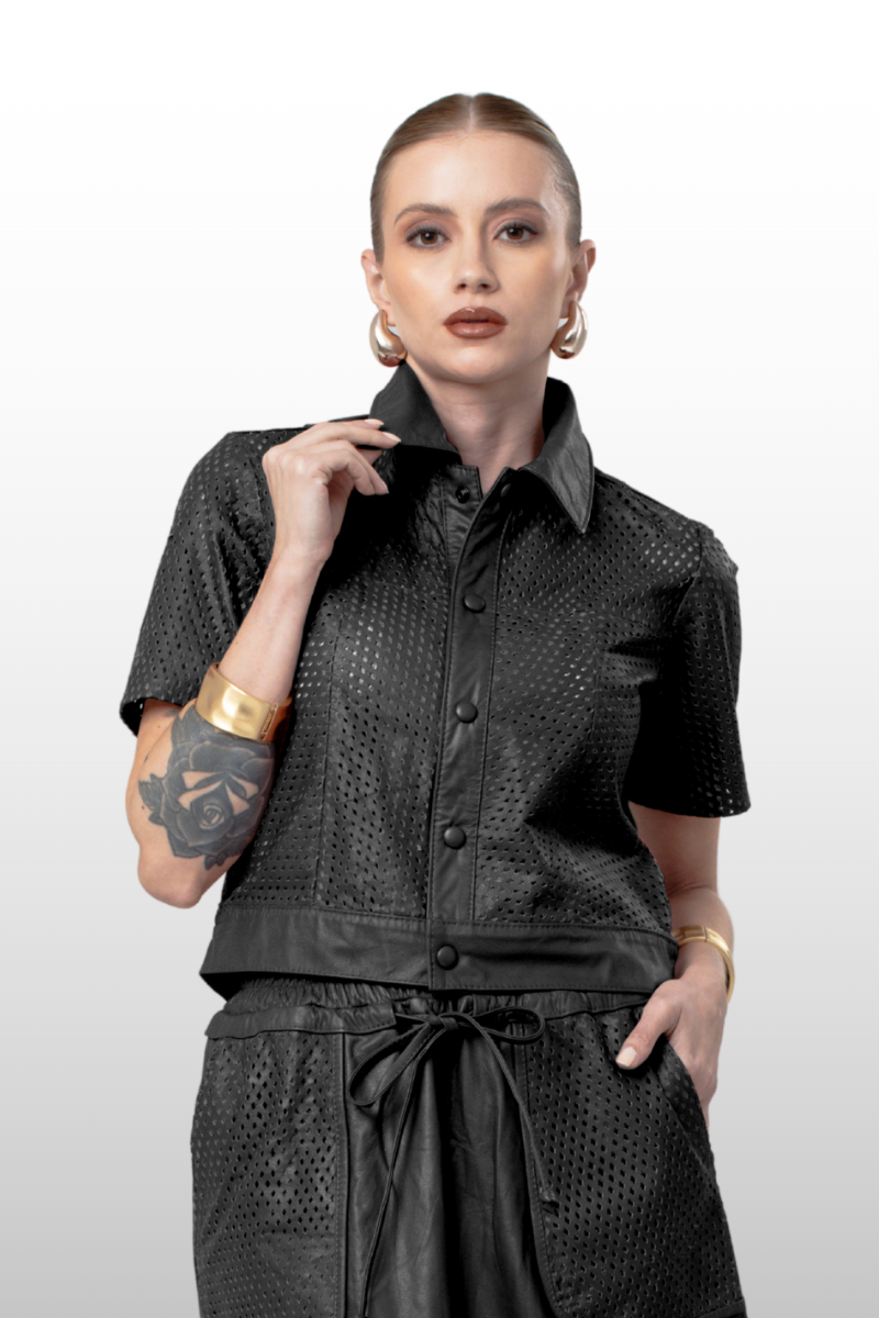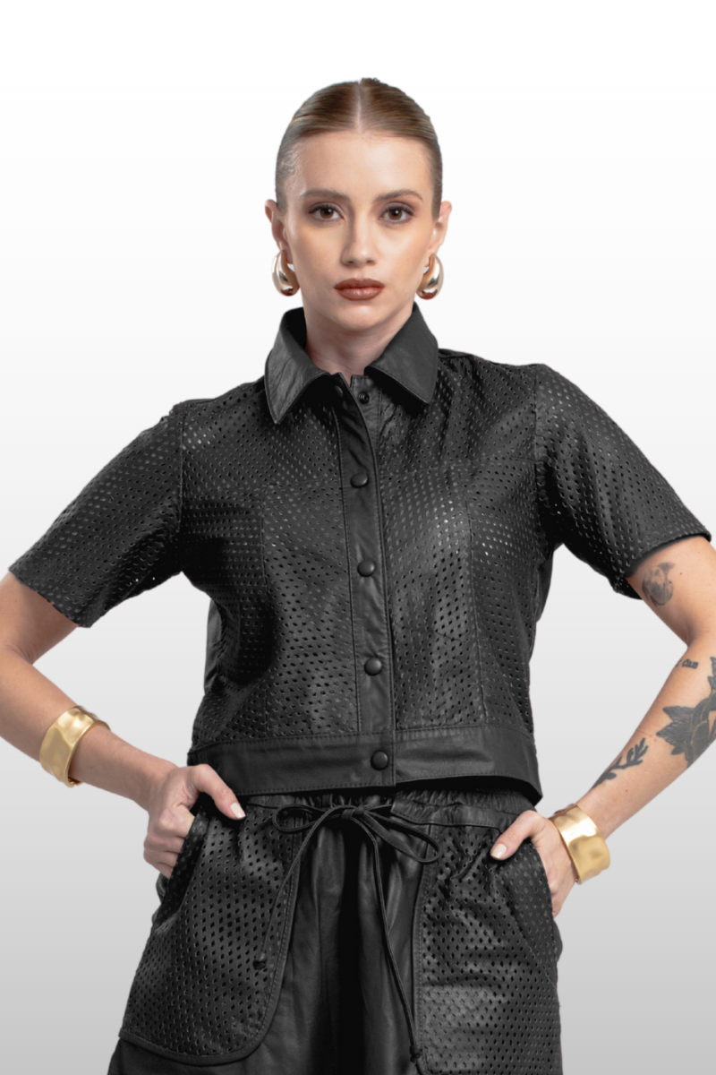 Casaqueto Romena em couro legítimo liso e perfurado. Possui gola alta italiana, manga curta e fechamento frontal com botões de pressão encapados. Forro 100% poliéster.