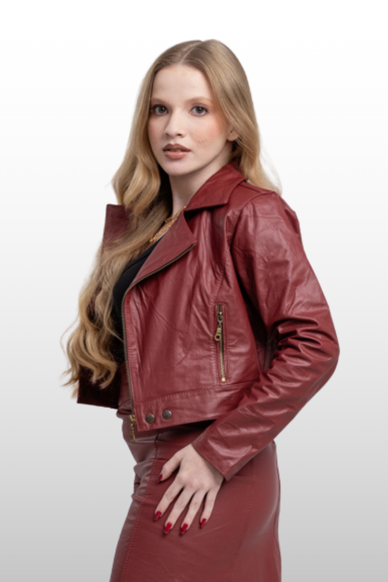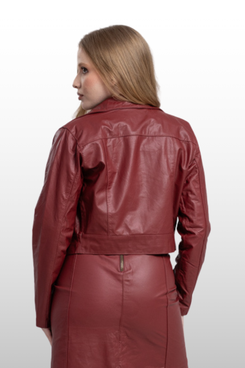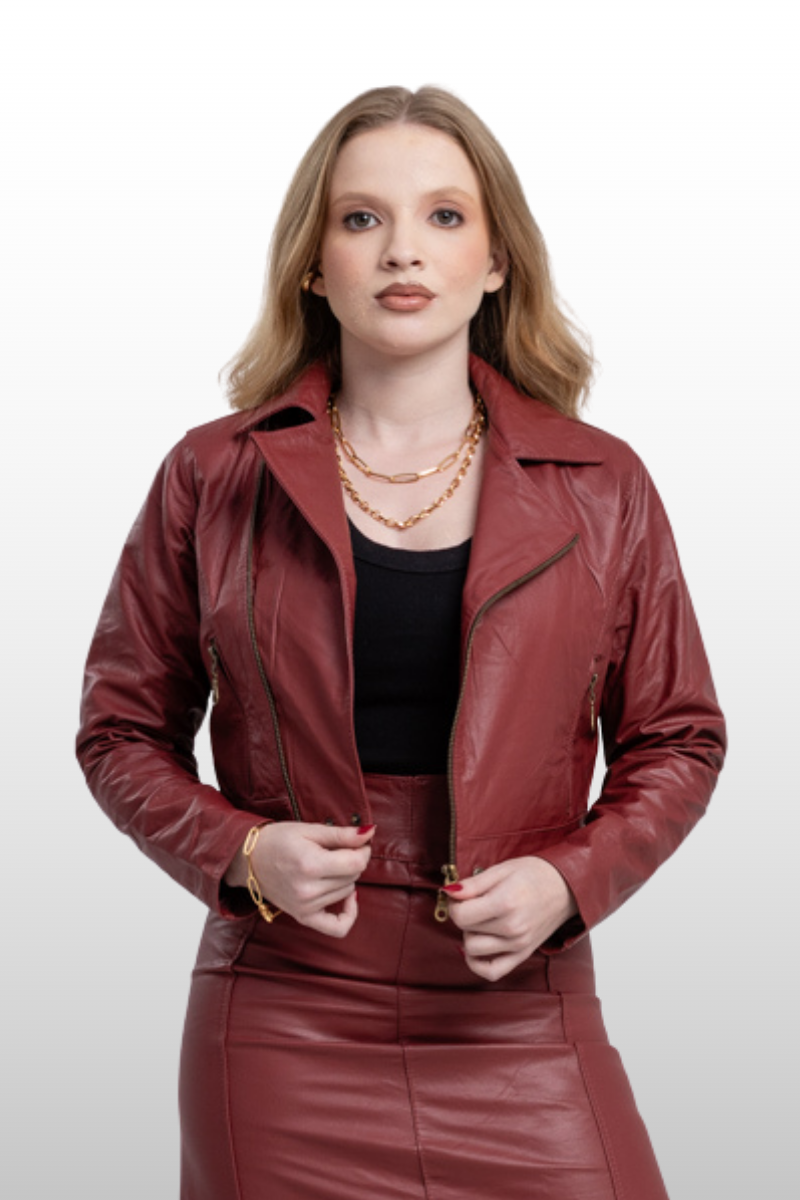 Jaqueta Ana Cláudia em couro legítimo, com modelagem de cintura marcada, punhos e braços ajustados. Possui fechamento frontal em zíper de metal e botões de pressão. Forro 100% poliéster.