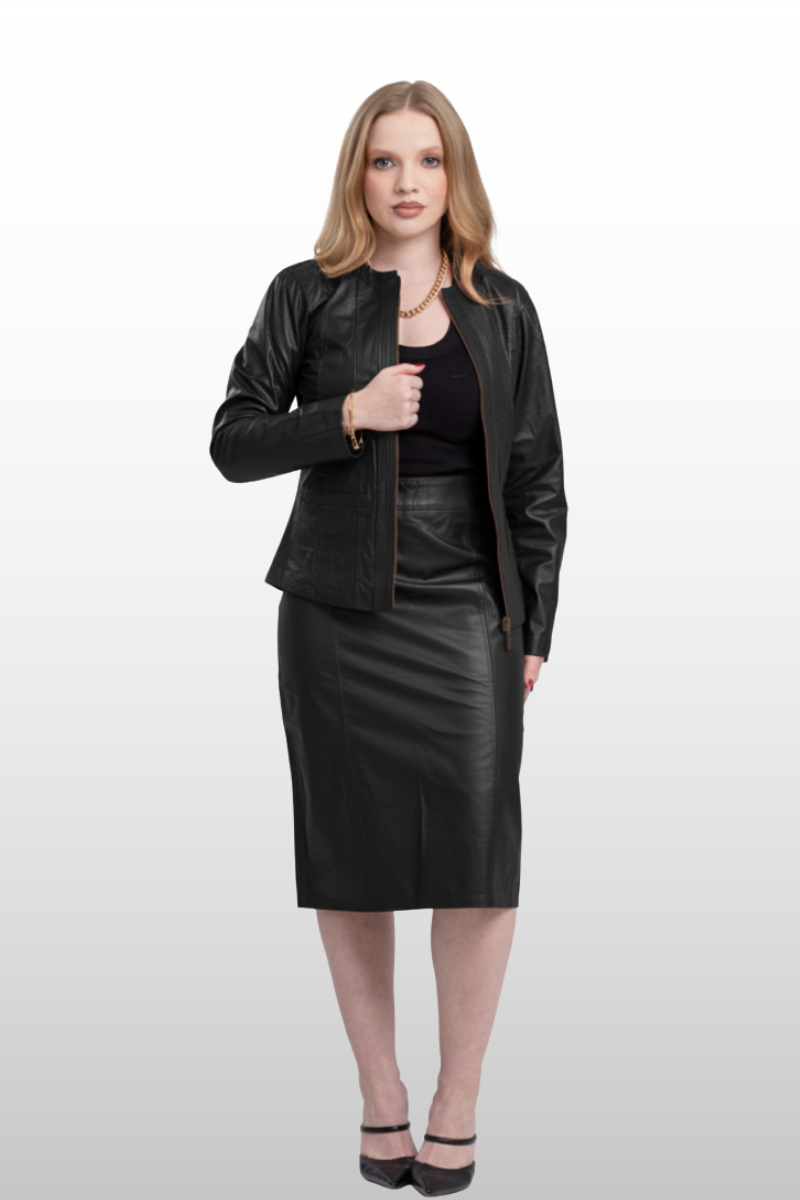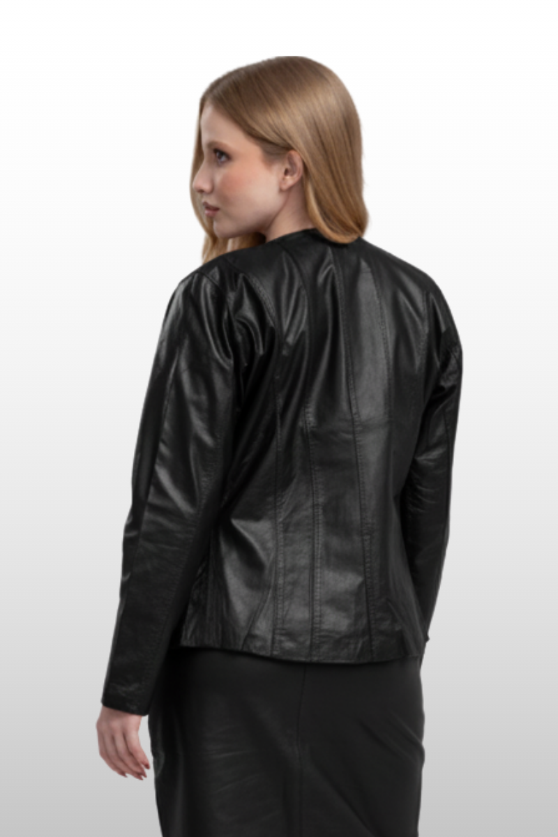Jaqueta Clara em couro legítimo, com modelagem de cintura marcada. Possui dois bolsos frontais com lapelas, fechamento frontal em zíper de metal e design sem gola. Forro 100% poliéster.