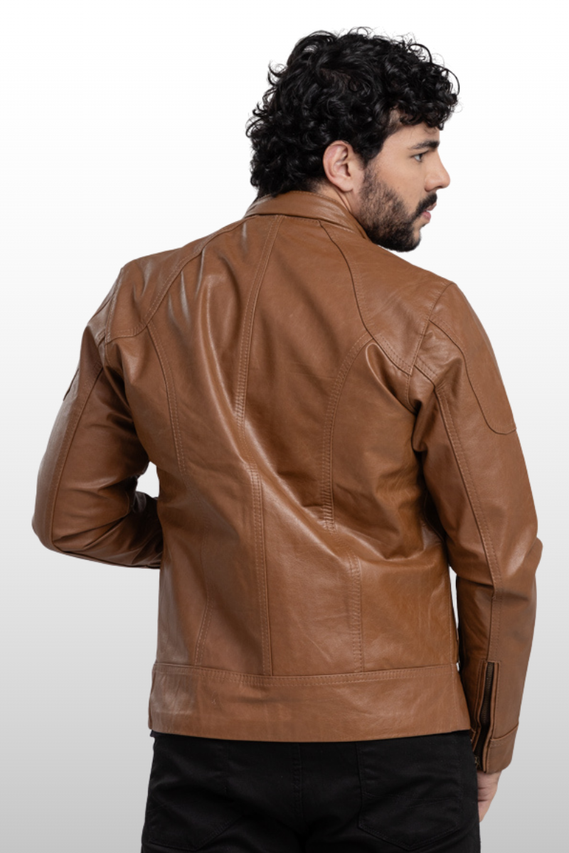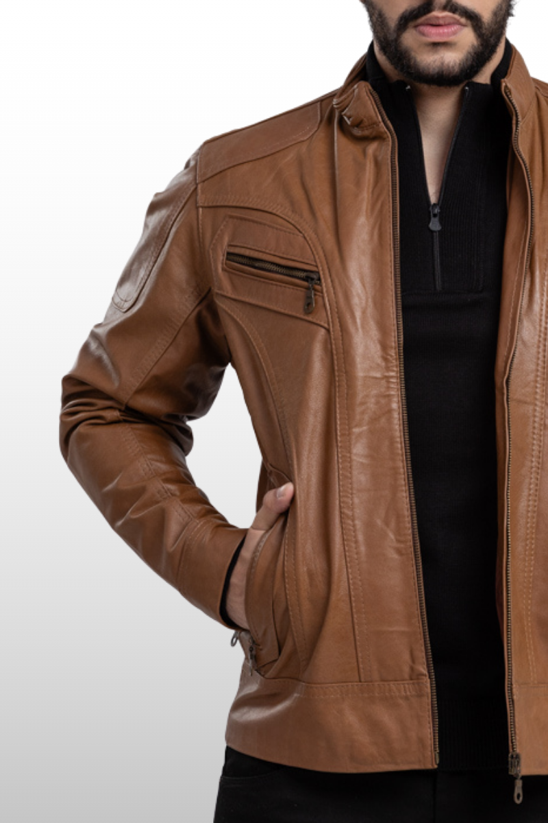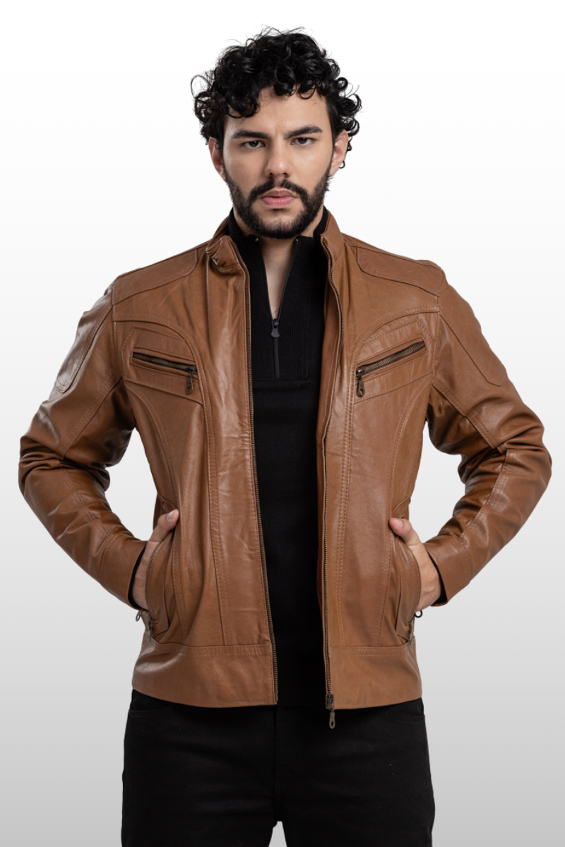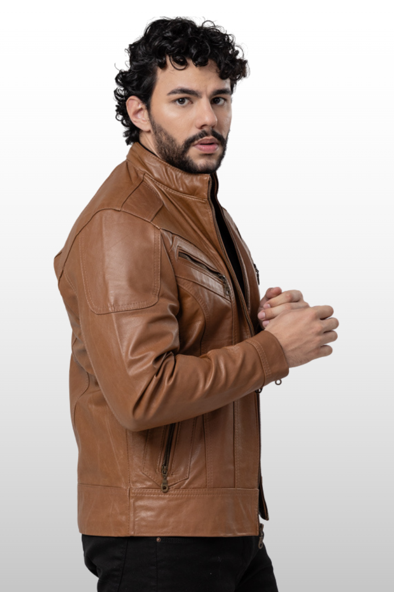 Jaqueta Dan em couro legítimo. Possui quatro bolsos frontais com fechamento em zíper de metal, um bolso interno, gola alta, fechamento frontal em zíper de metal e ajuste nos punhos com zíper. Forro 100% poliéster.