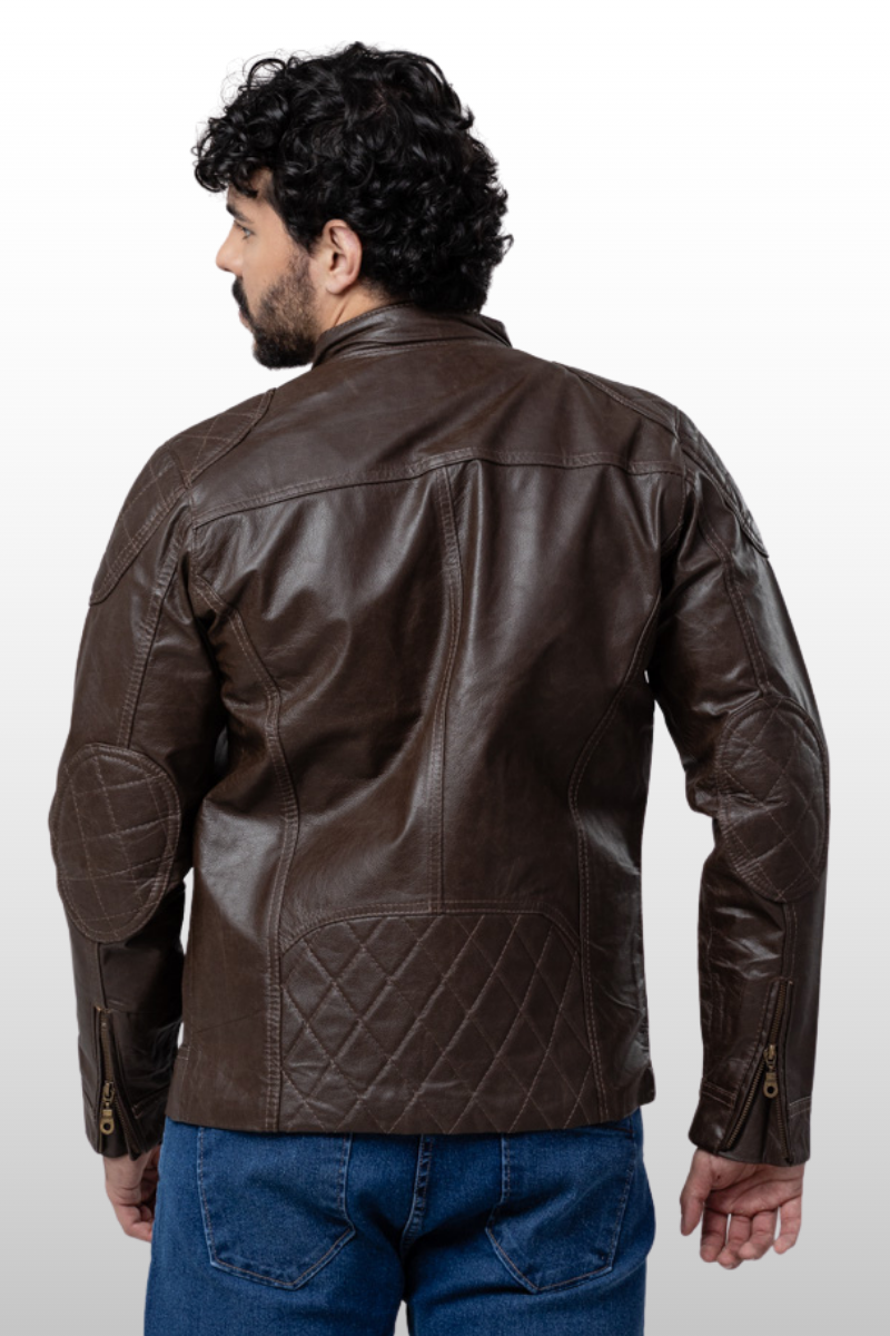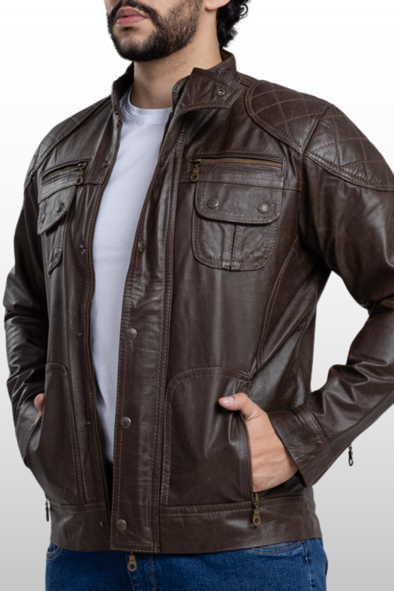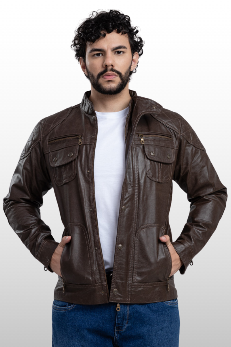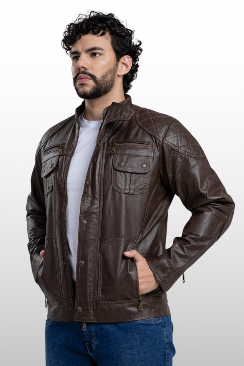 Jaqueta Edu em couro legítimo. Possui dois bolsos frontais com fechamento em botão de pressão, quatro bolsos frontais com fechamento em zíper de metal, um bolso interno, gola curta com fechamento em botão de pressão, zíper de metal na manga para ajuste e detalhes em matelassê nos cotovelos, ombros e parte inferior das costas. Apresenta fechamento central em zíper de metal e botão de pressão. Forro 100% poliéster.