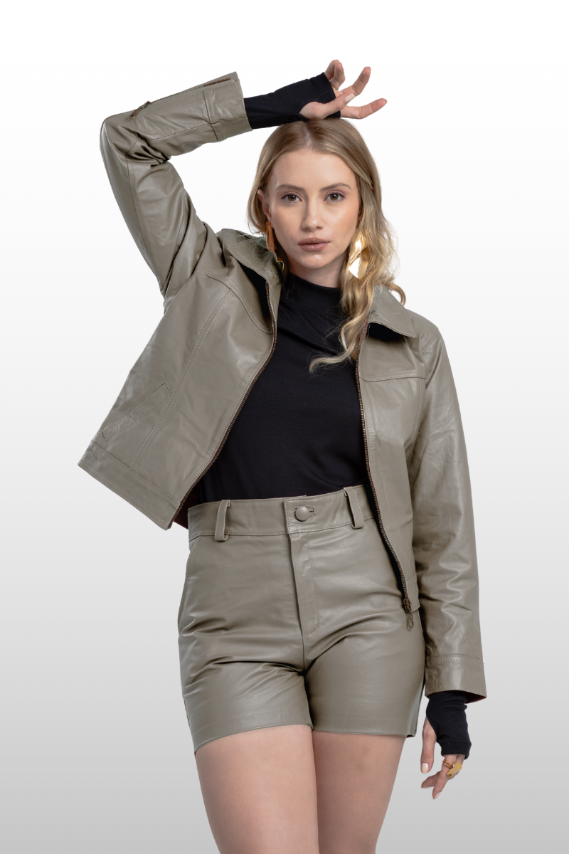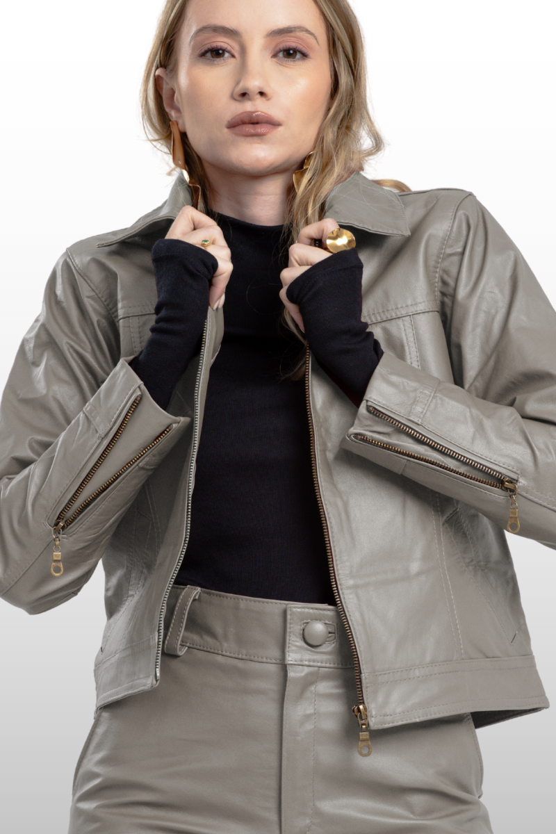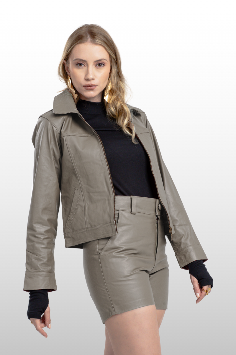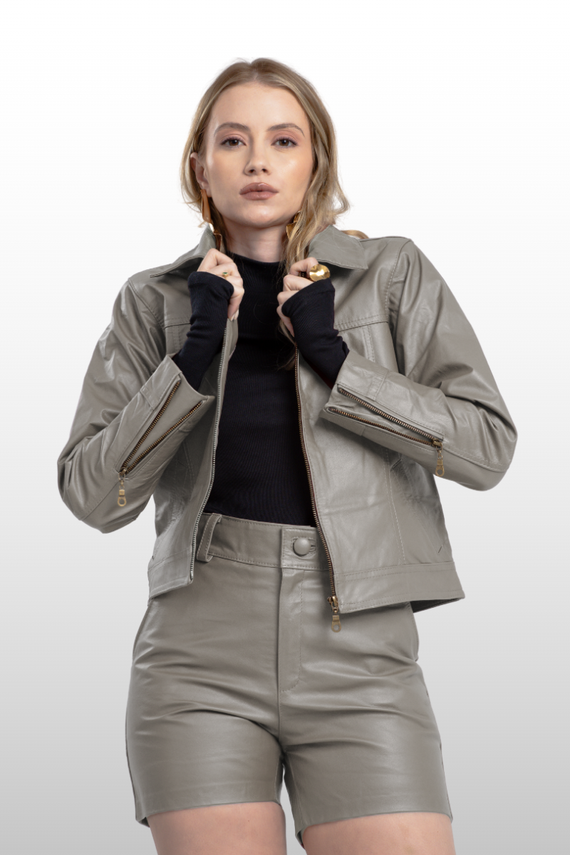 Jaqueta Fernanda em couro legítimo, com modelagem reta, punhos e braços ajustados. Possui dois bolsos frontais, zíper de metal na manga para ajuste e fechamento frontal em zíper de metal. Forro 100% poliéster.