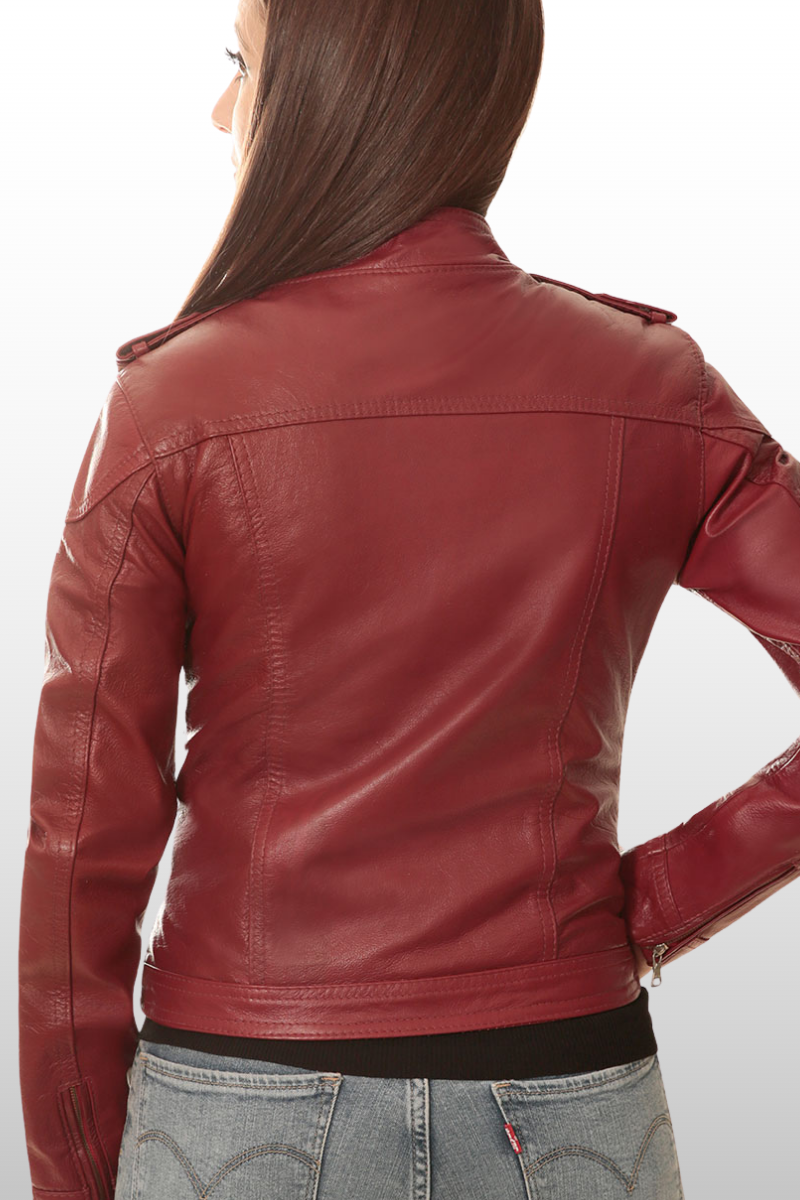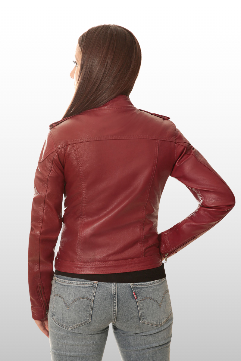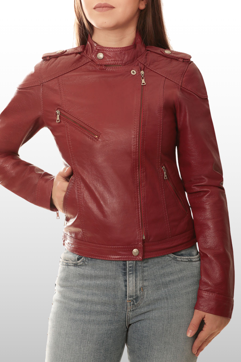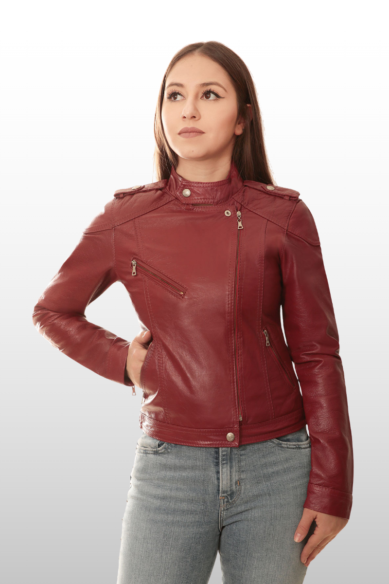Jaqueta Karen em couro legítimo, com modelagem de cintura marcada, punhos e braços ajustados. Possui três bolsos frontais com fechamento em zíper, fechamento frontal em zíper de metal e botão de pressão, gola alta com fechamento em botão de pressão e tira nos ombros com fechamento em botão de pressão. Forro 100% poliéster.