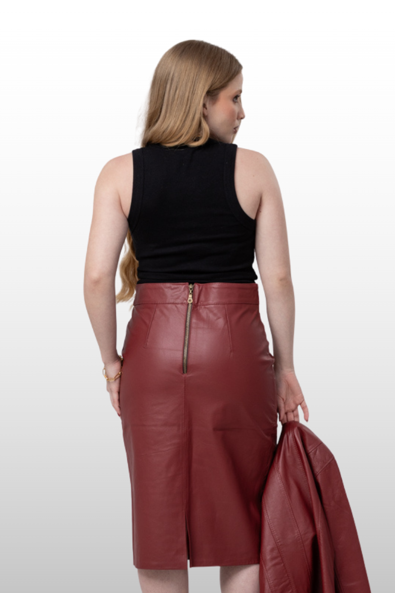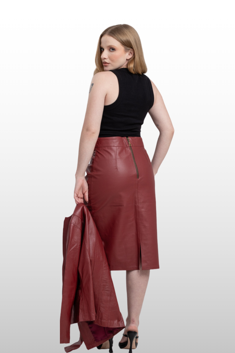 Saia Beatriz em couro legítimo, com modelagem lápis e cós alto. Possui fenda traseira e fechamento traseiro em zíper de metal. Forro 100% poliéster.