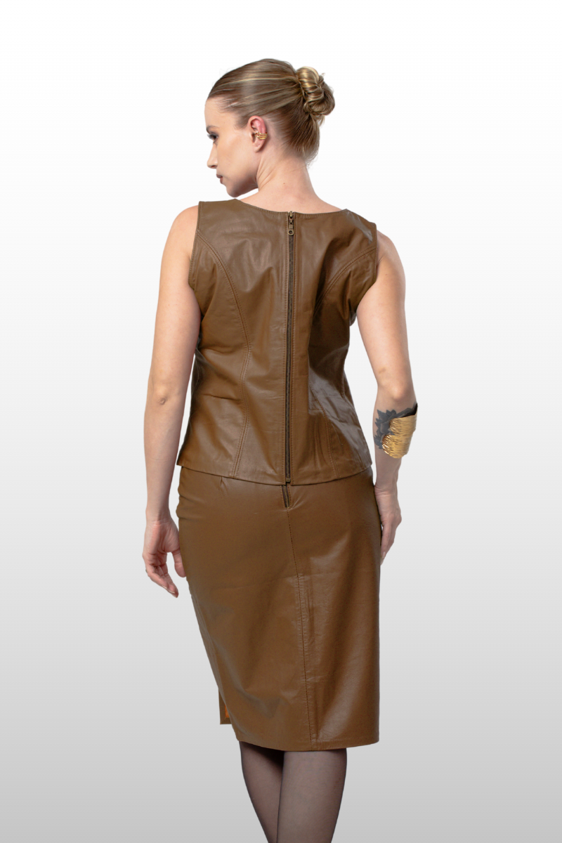 Saia Isabel em couro legítimo, com modelagem lápis e cós alto. Possui fenda na lateral e fechamento traseiro em zíper de metal. Forro 100% poliéster.