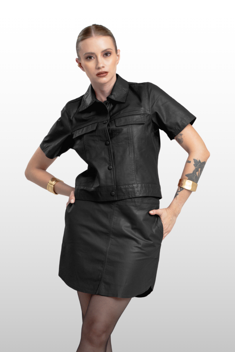 Saia Luna em couro legítimo, com cós alto e modelagem de cintura marcada. Possui corte arredondado na barra e fechamento traseiro em zíper de metal. Forro 100% poliéster para maior conforto.