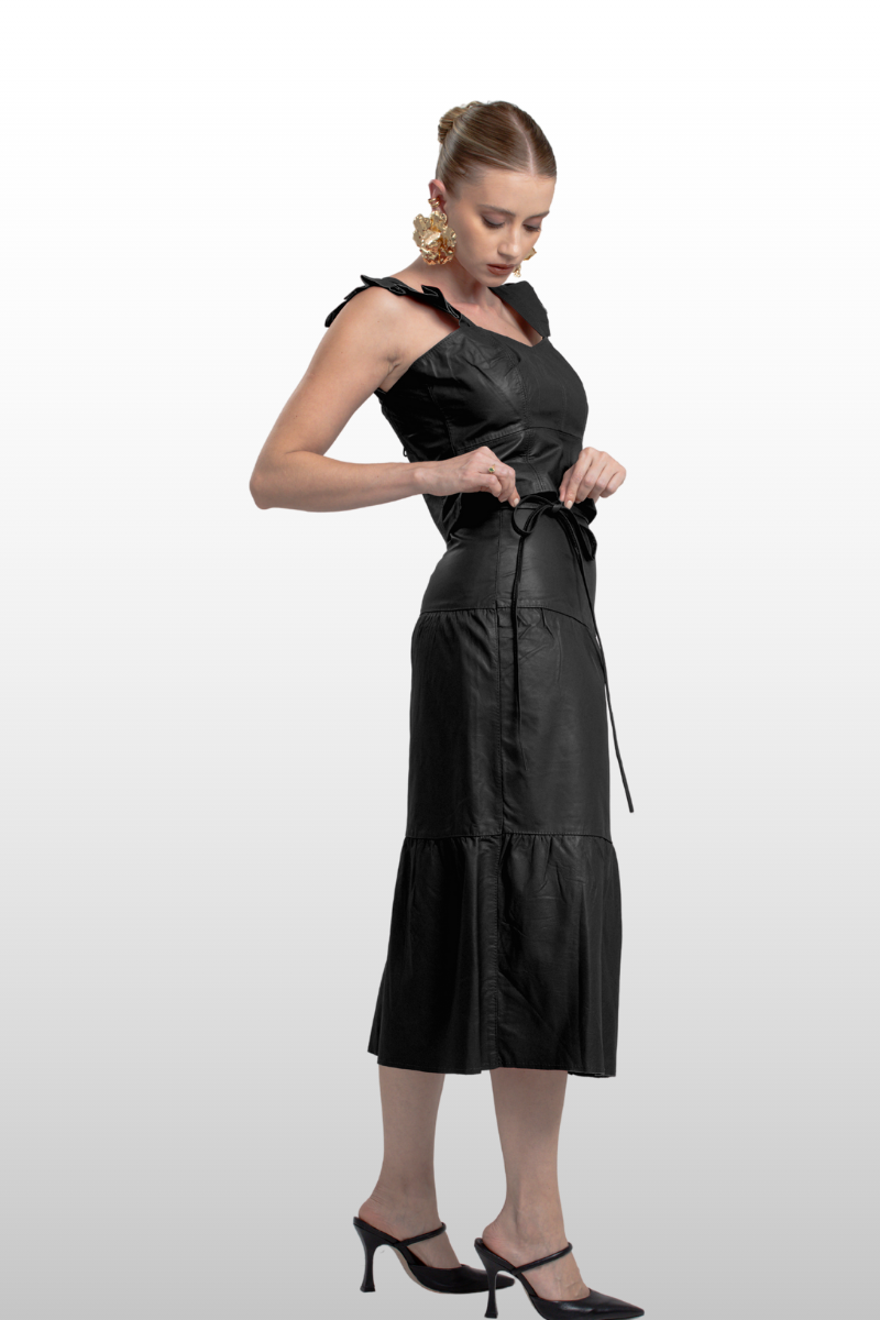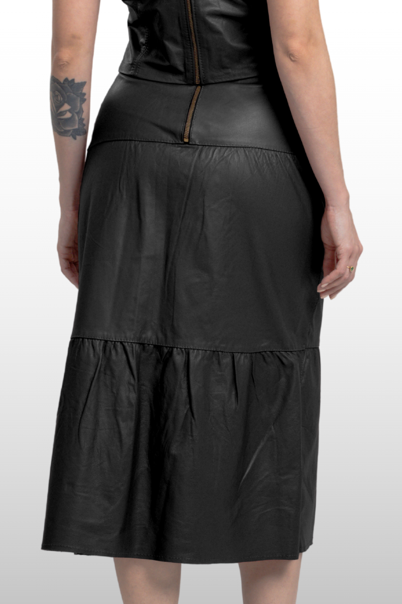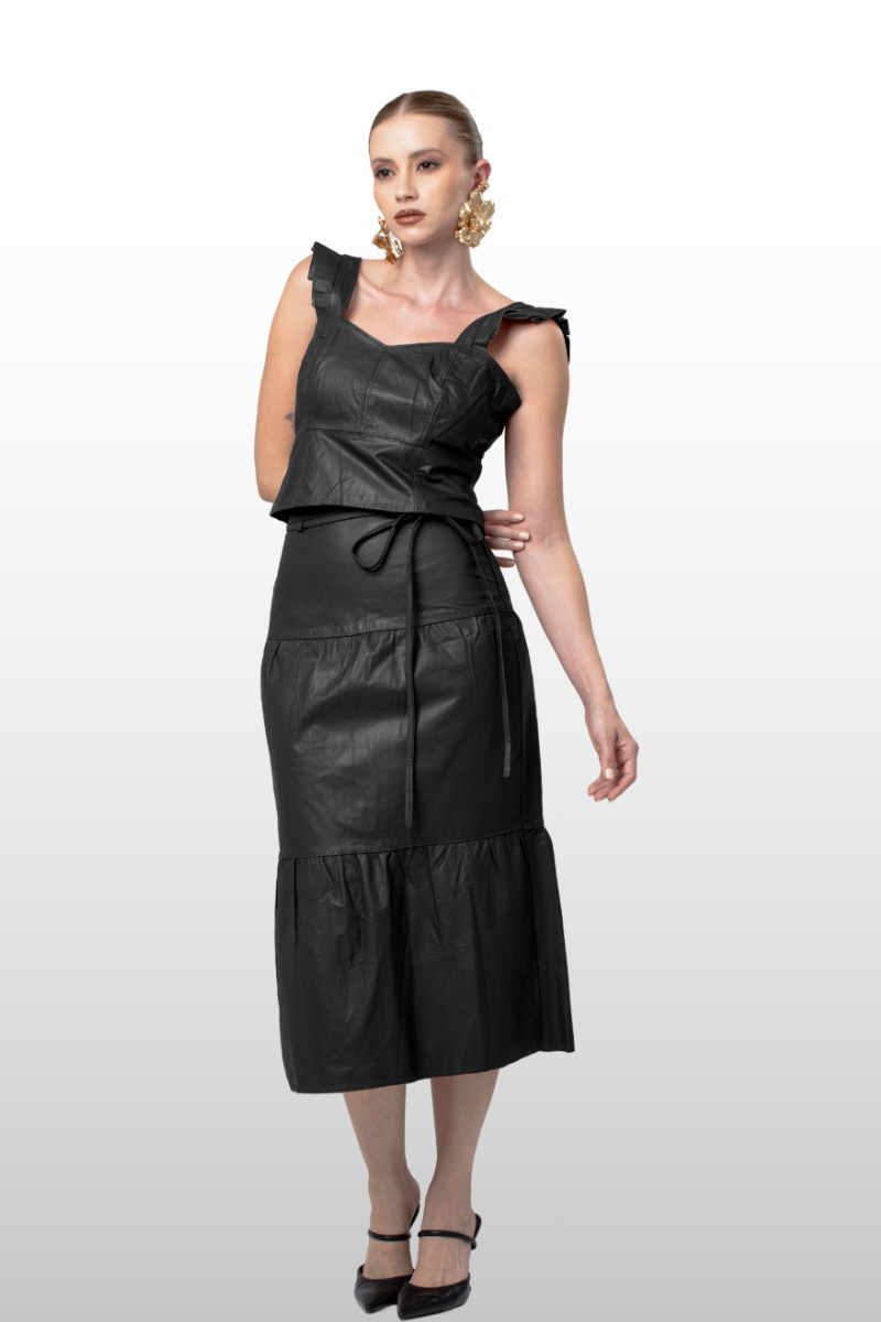 Saia Maria em couro legítimo, com modelagem de cós alto e evasê. Possui tira de amarrar na cintura e fechamento traseiro em zíper de metal. Forro 100% poliéster.