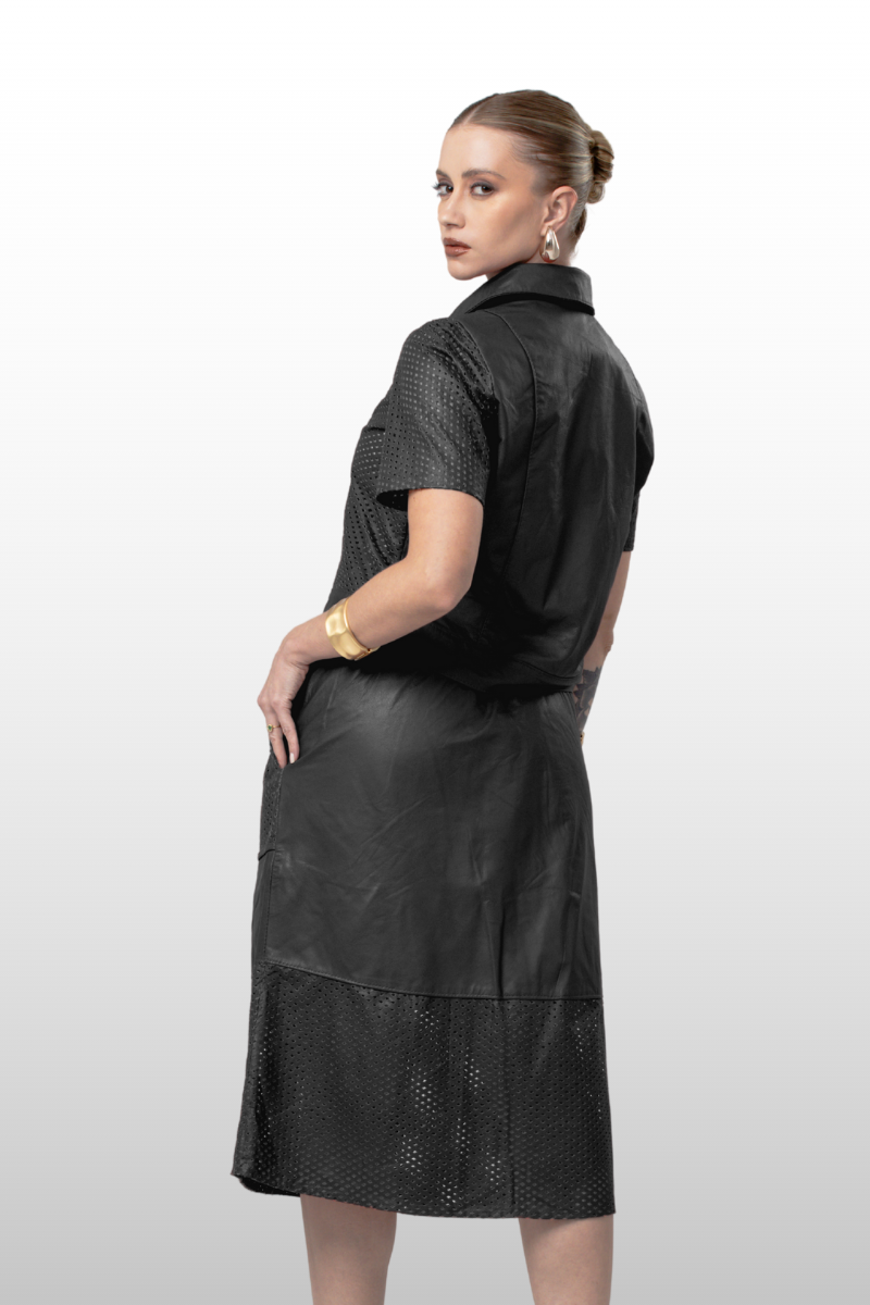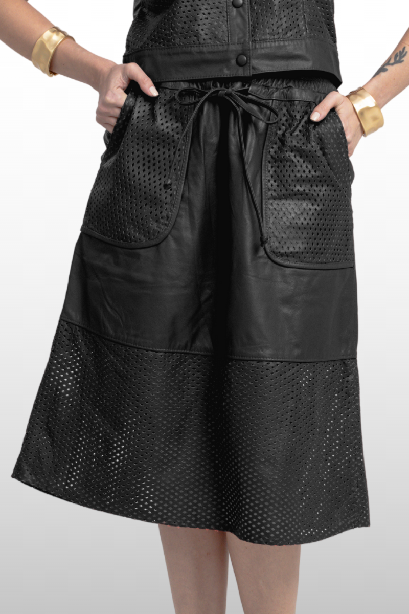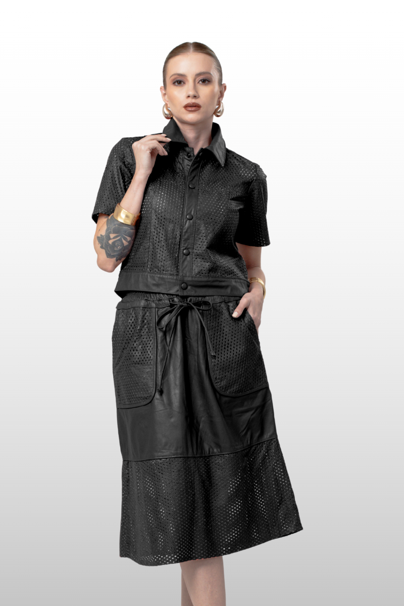 Saia Romena em couro legítimo liso e perfurado, com modelagem de cós alto e evasê. Possui dois bolsos frontais, elástico na cintura e tira para amarração. Forro 100% poliéster.