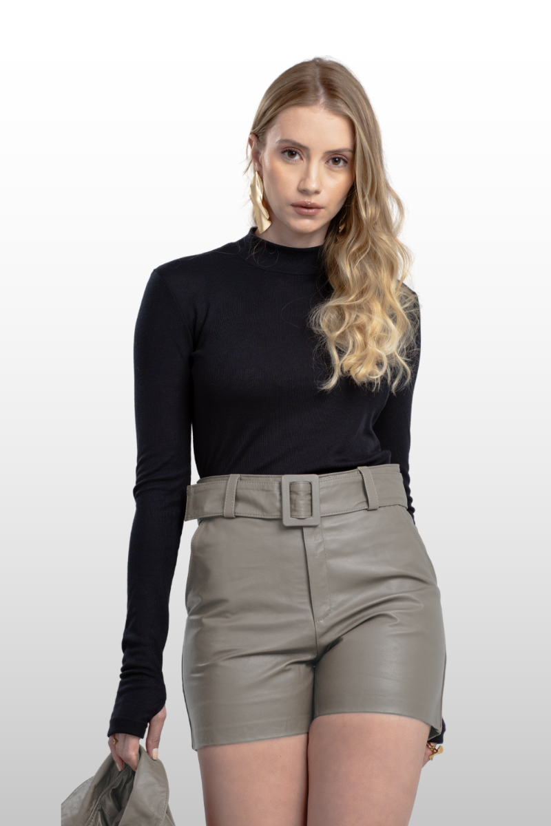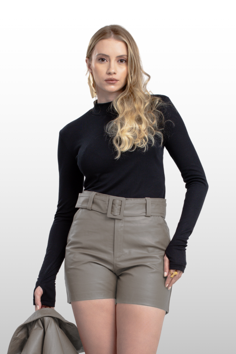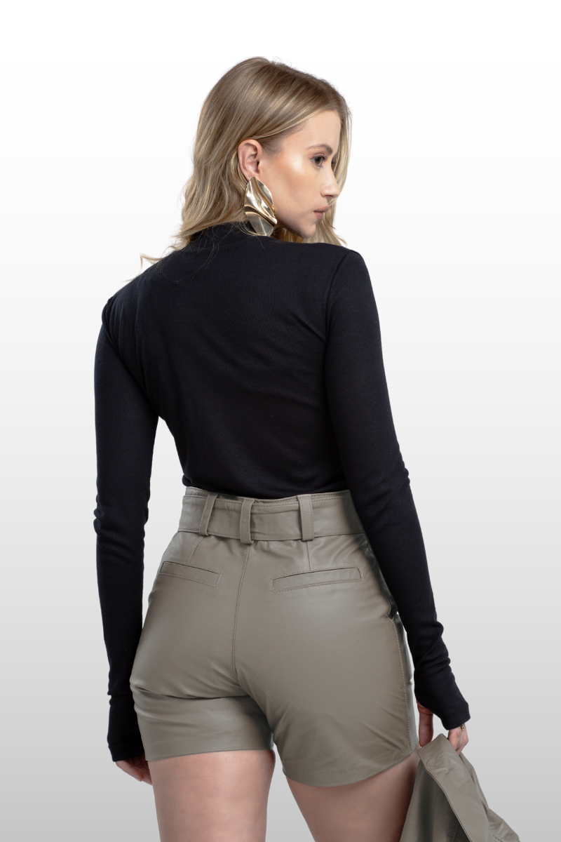 Shorts Patrícia em couro legítimo, com modelagem de cós alto. Possui cinto removível, dois bolsos faca nas laterais e dois bolsos traseiros embutidos.
