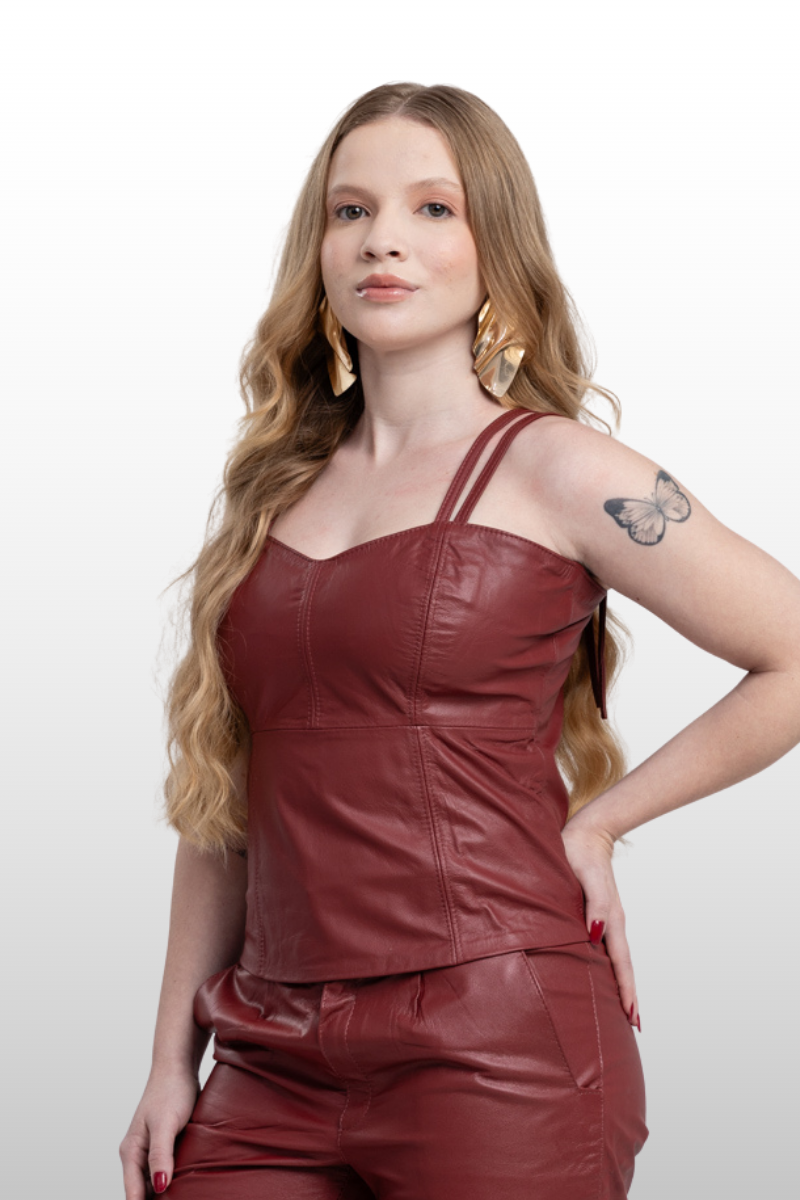 Top Bianca em couro legítimo, com modelagem de cintura marcada e decote coração. Possui quatro alças finas reguláveis com fivelas em metal e fechamento traseiro em zíper de metal.