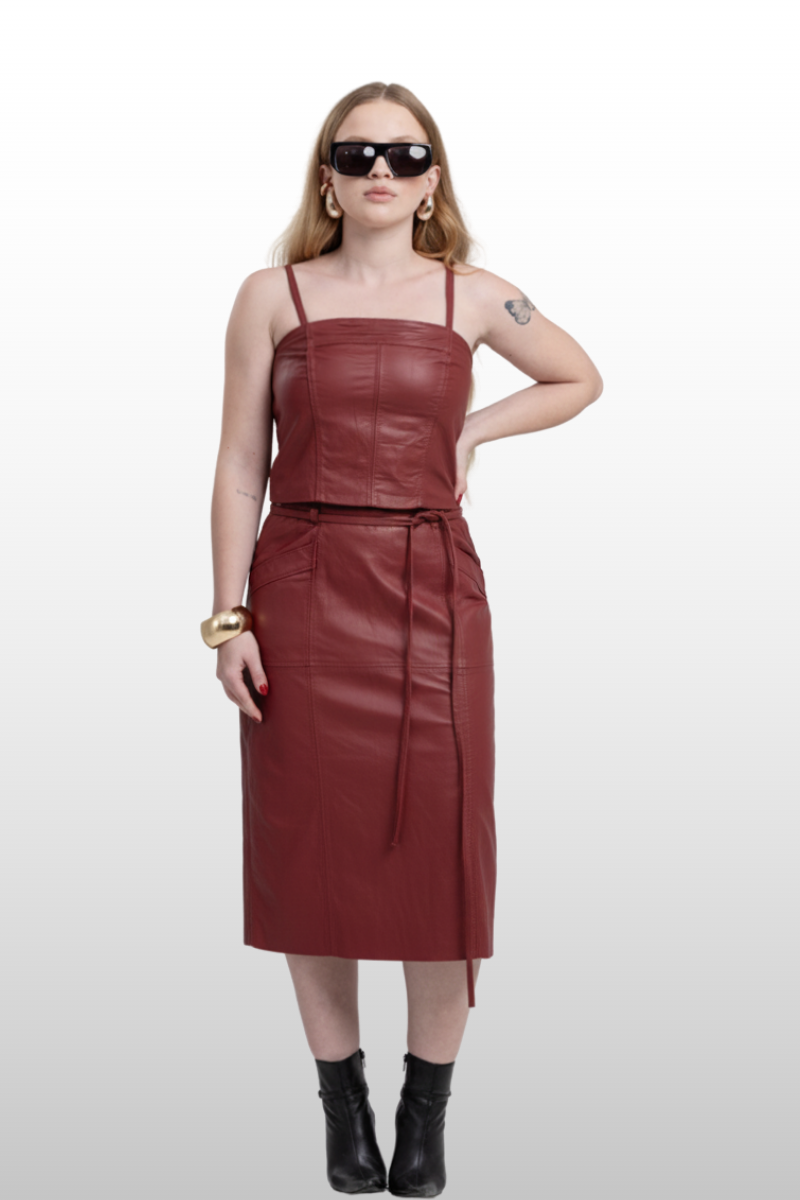 Top Filó em couro legítimo, com modelagem de cintura marcada e decote arredondado. Possui 2 alças finas e fechamento traseiro em zíper de metal.