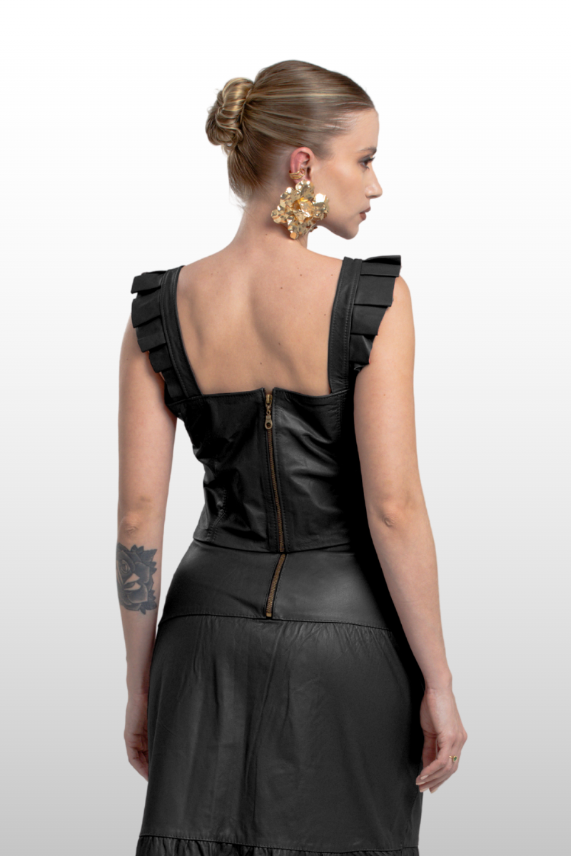 Top Selina em couro legítimo, com modelagem de cintura marcada e decote coração. Possui duas alças largas com detalhe plissado e fechamento traseiro em zíper de metal.