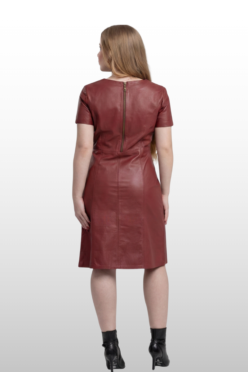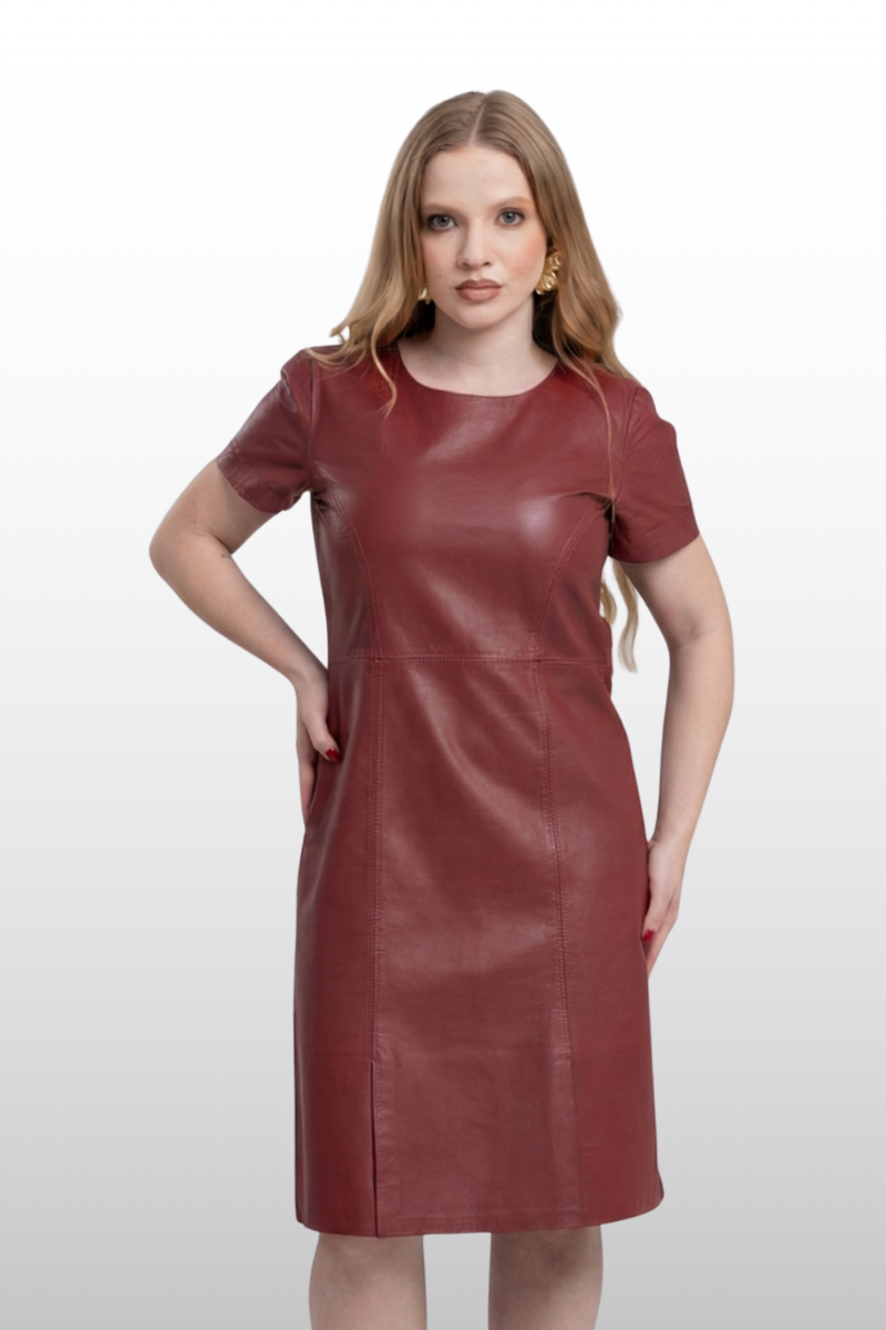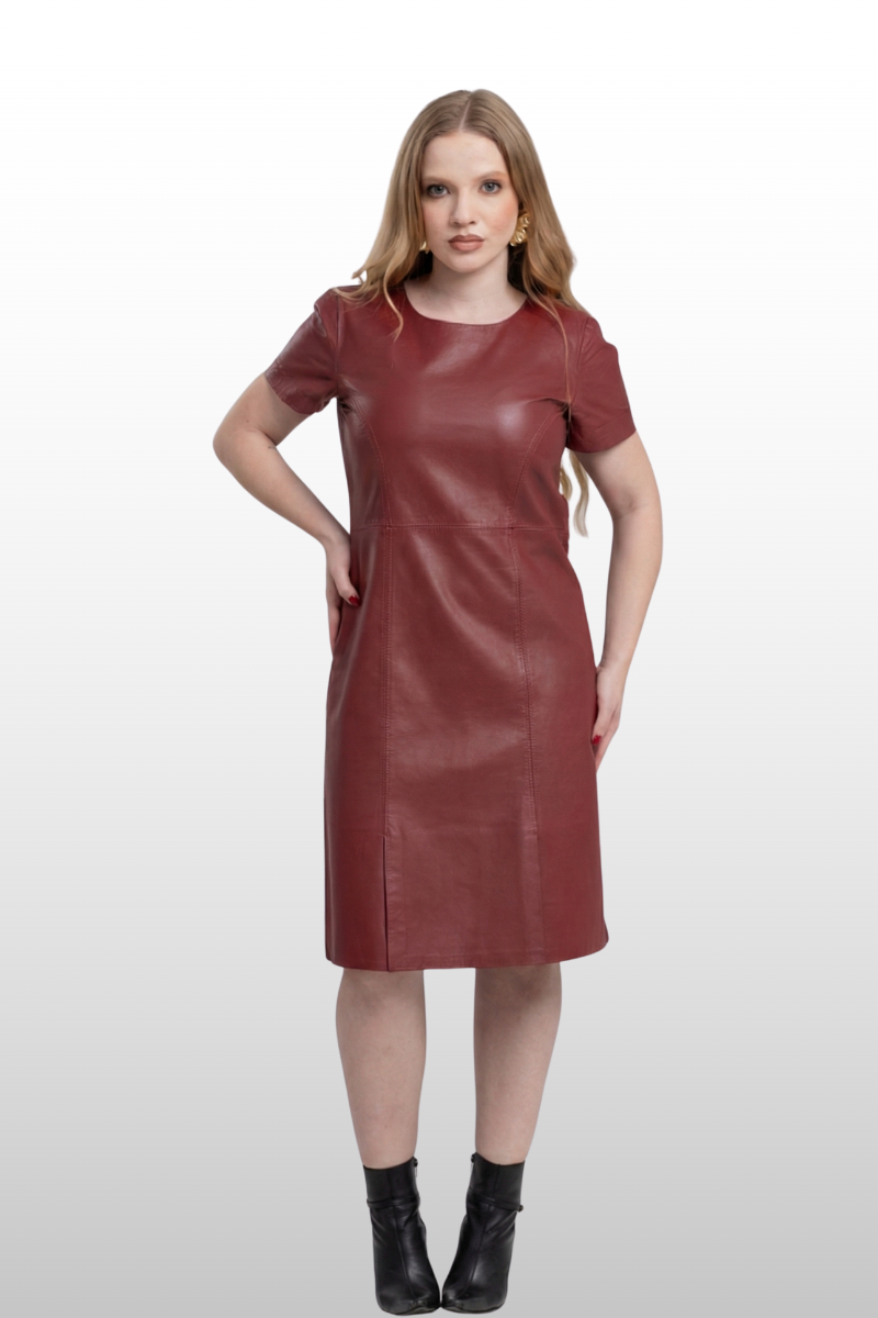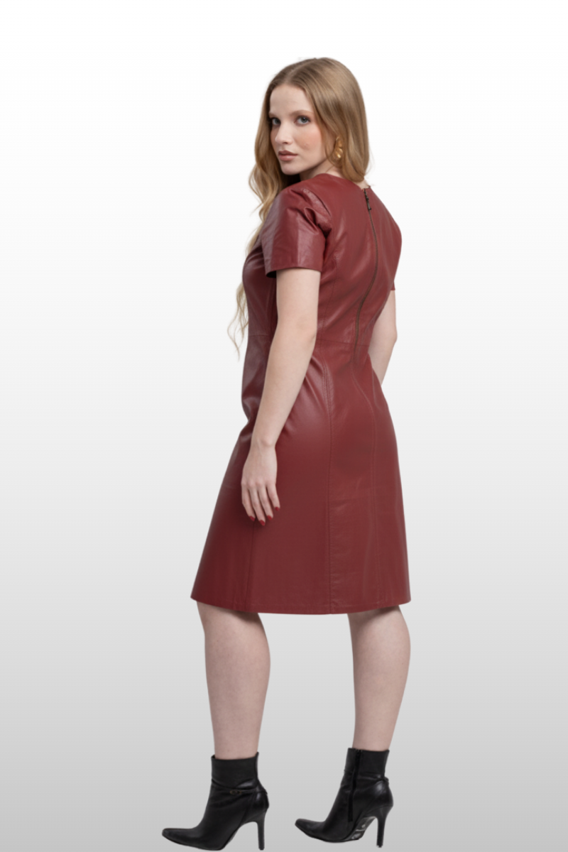 Vestido Amélia em couro legítimo, com decote arredondado e modelagem reta. Possui fenda lateral e fechamento traseiro em zíper de metal. Forro 100% poliéster.